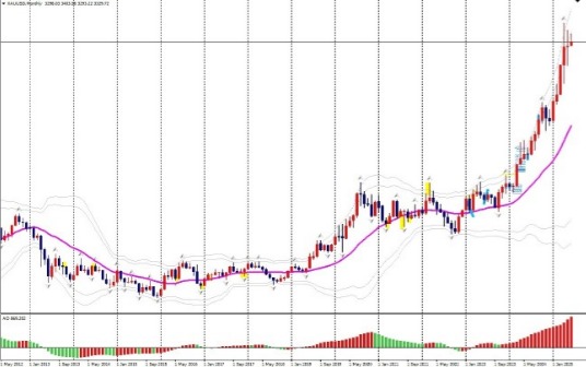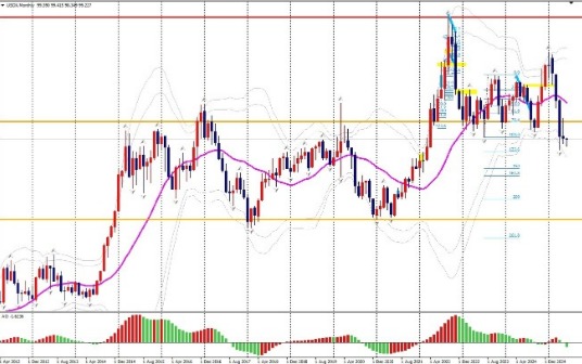 附圖一為2012年迄今之美元走勢圖,宏觀而言,2014至2022年三月,基本上美元處於89與100整數關卡間區間徘徊,然而,伴隨通貨膨脹率不斷攀高,美聯儲於2022四月開始採取激進的升息策略,以致於2022年4月走勢大漲,出現大陽K正式突破100整數大關並一路飆高至114.580左右創造歷史高點。之後便於100.000與114.580間呈現區間震盪,未能再創新高。2025 4月,美元指數受到美中貿易局勢的持續惡化、科技技術與產品之出口限制升級以及投資者對總體經濟前景的疑慮所影響,正式跌破100.000整數大關,技術分析上也已經跌破布林通道之中軌,但從技術分析角度觀察,未來恐將持續走空,這從2024年12月到2025年2月,三個月的K棒呈現三K反轉局勢,亦能一窺全貌。